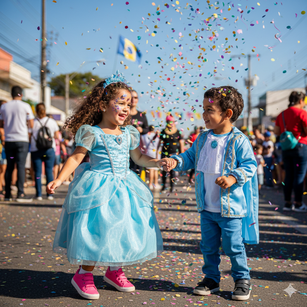 Carnaval no Brasil é sinônimo de calor. Lembre-se da nossa lição sobre tecidos: se o vestido for de um material que não respira bem (como alguns cetins sintéticos), certifique-se de que a criança use uma regata de algodão por baixo ou faça pausas frequentes na sombra com muita água.